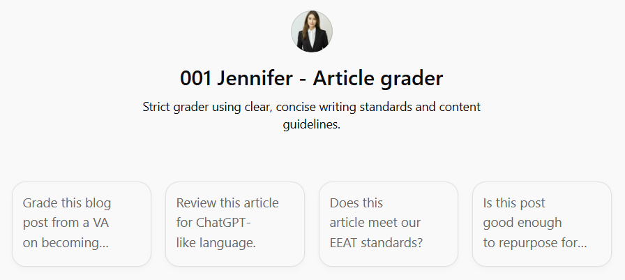 Our “Jennifer” GPT grader keeps our writers honest. She grades ruthlessly, counts specifics, and enforces the blog posting guidelines that make our content sound like us, not like ChatGPT.