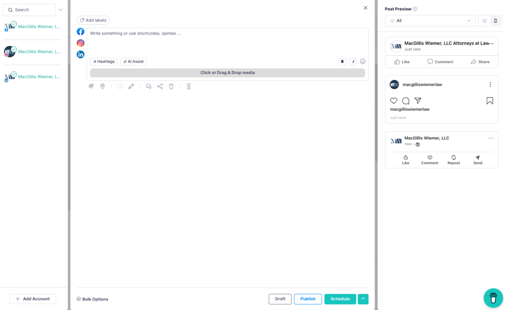 Law firms, particularly in the personal injury space, need to project a consistent, trustworthy image across all communications. Cross-posting helps reinforce our brand message. At MacGillis Wiemer, we emphasize genuine client relationships, high-quality communication, and a commitment to client care. By using cross-posting, we ensure that clients, whether they find us on Facebook or LinkedIn, see the same commitment to these values, building their trust in us as a firm.